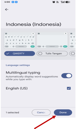 ● The Indonesian keyboard will be added to your current keyboard settings according to the selected option.