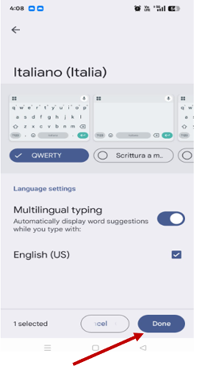The Italiano keyboard will be added to your current keyboard settings according to the selected option.