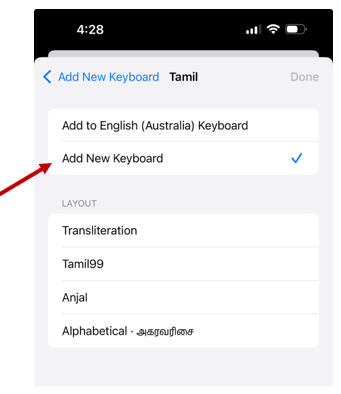 ● Tap + Add Keyboard and choose Tamil from the list.