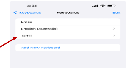 ● Select "Add New Keyboard" and choose Tamil from the list.